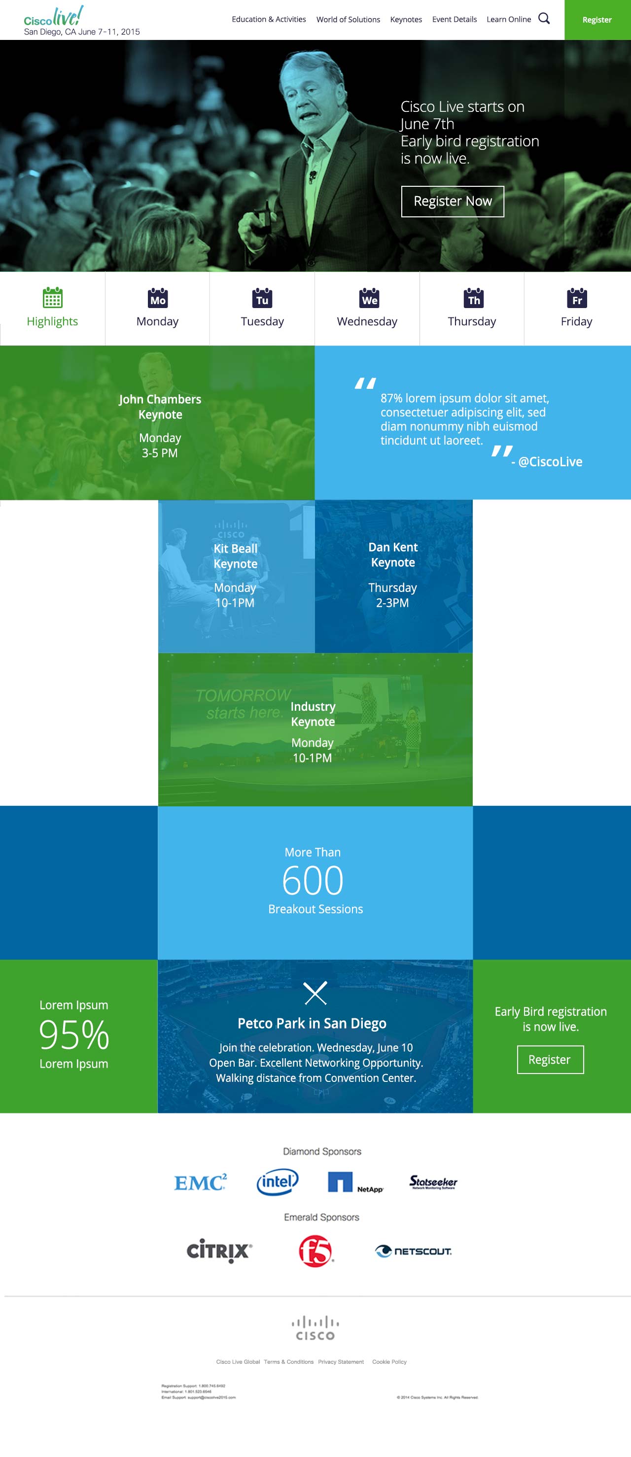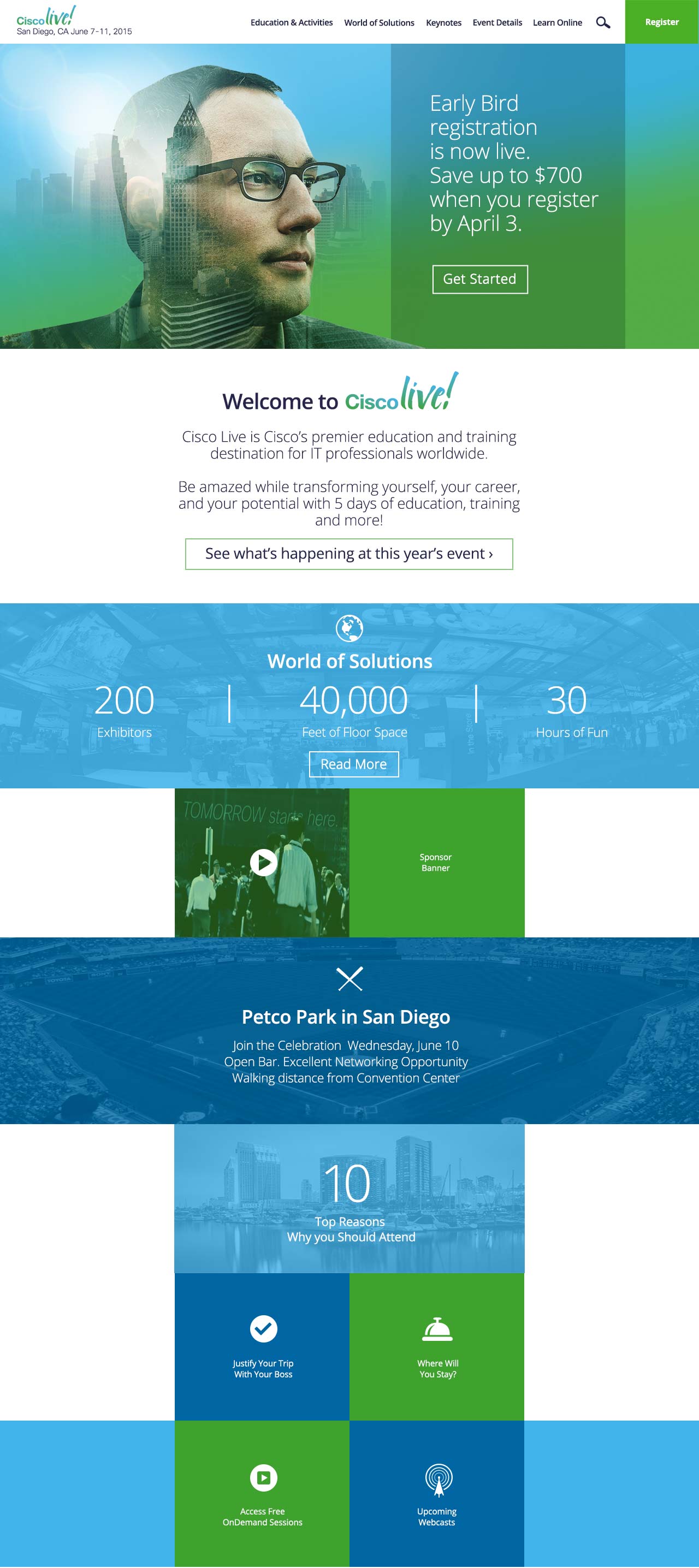 Cisco asked gyro to build a new website for its CiscoLive conference in San Diego. The new website was to be built for the three phases of the event. Pre-event, as a place to register and learn more. During the conference, as a daily calendar reference, providing times and locations for all talks and workshops. Post-event, to thank attendees and give them a sneak peek of next years conference.